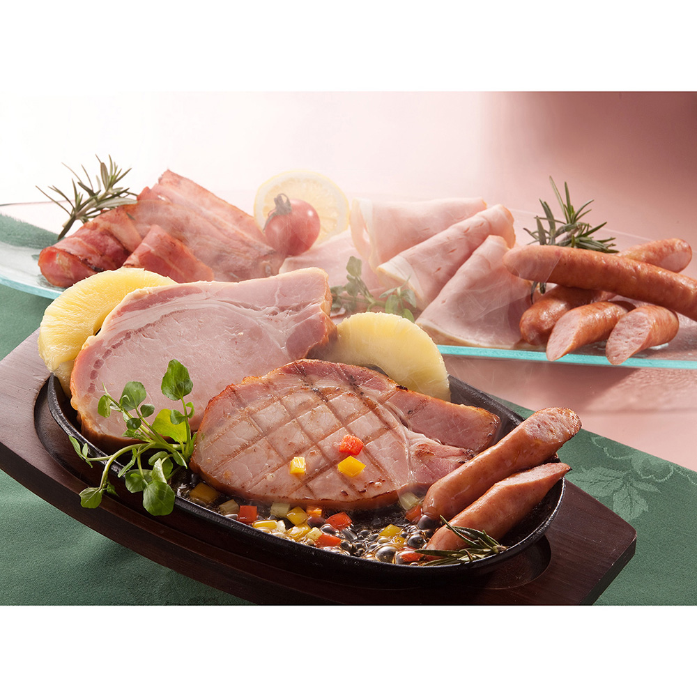 ■規格:ロースハムステーキ150g、ロースハムスライス79g×2、ボンレスハムスライス80g、ベーコンスライス80g、あらびきウインナー130g、ブラートブルスト120g