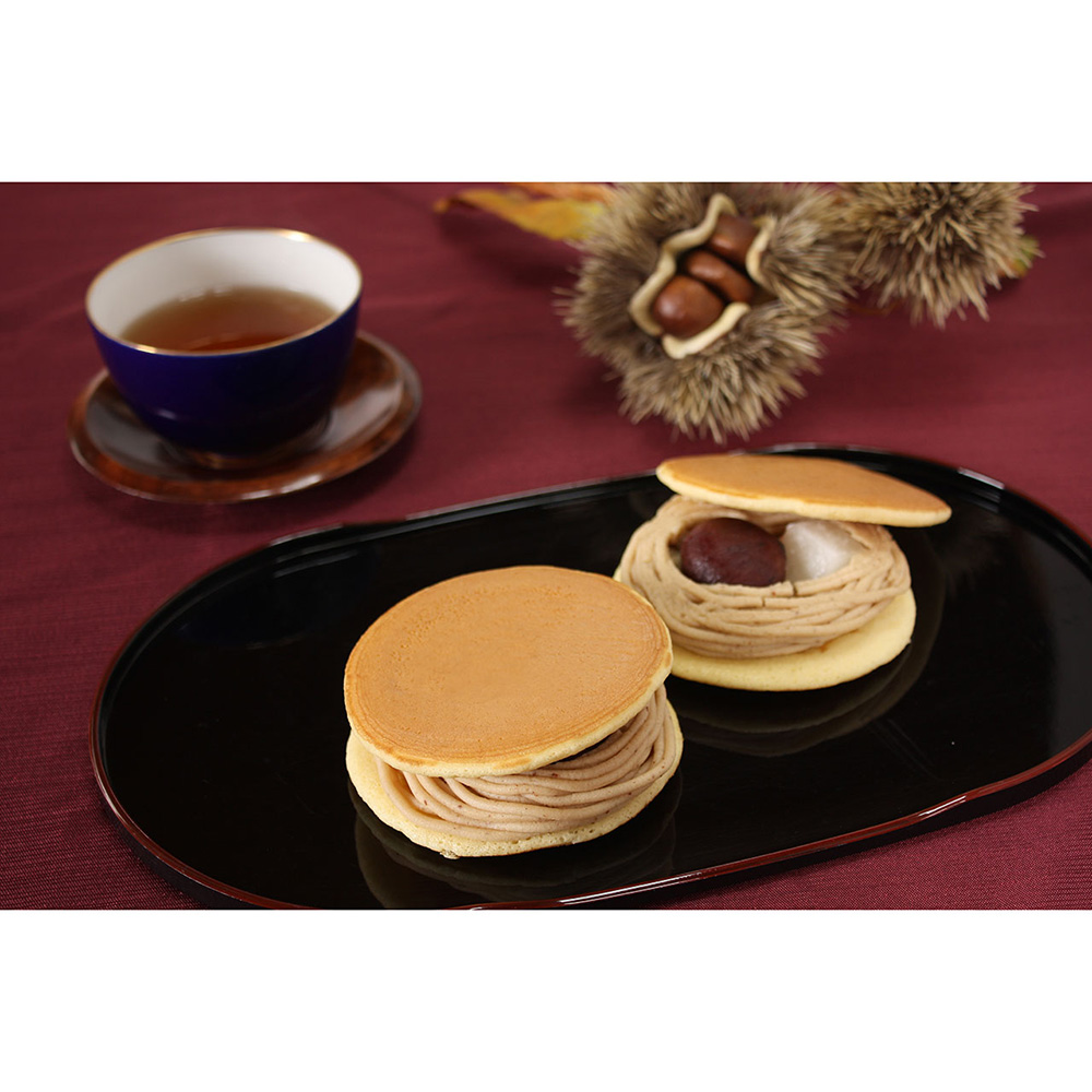 風味豊かでなめらかな口当たりの特製モンブラン餡に渋皮付き一粒栗と求肥餅をのせふんわり焼き上げたどら焼き生地で挟んだ創作スイーツです。