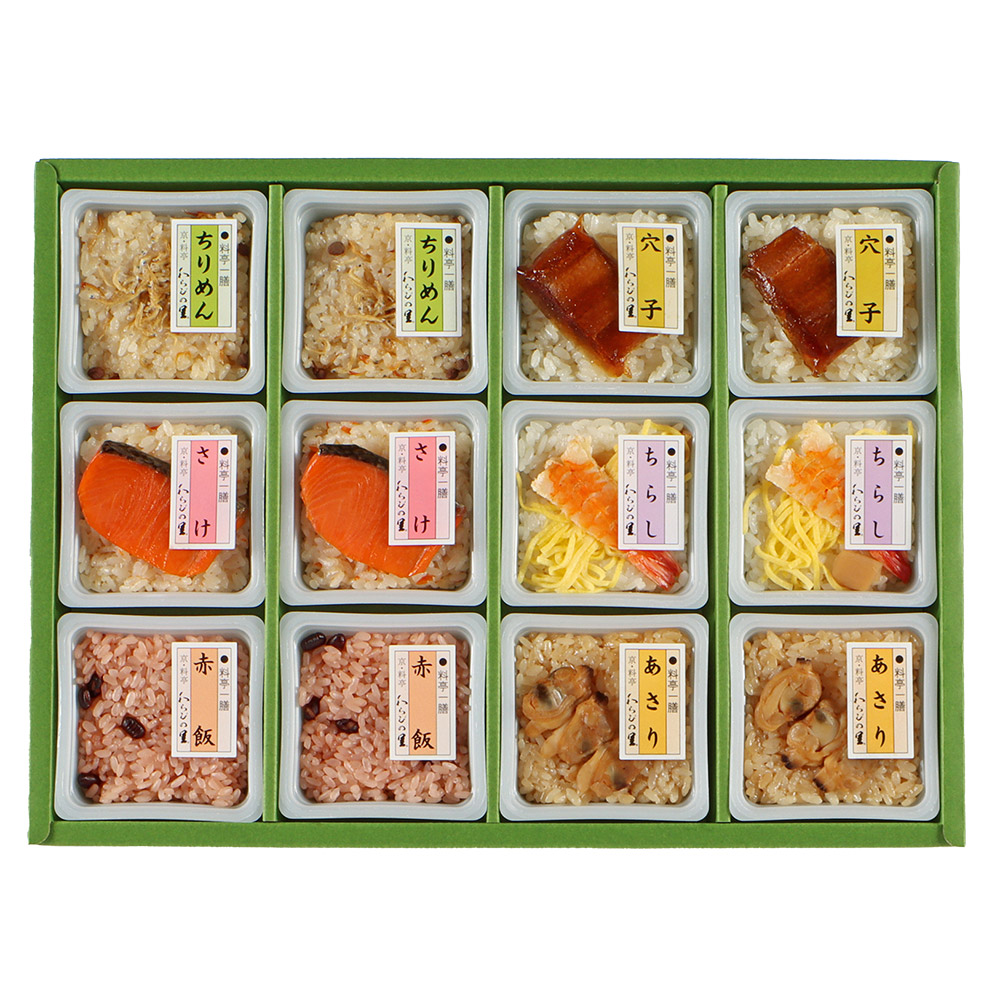 ■原材料名:ちりめんご飯:うるち米(国産)、もち米(国産)、ちりめんじゃこ(国産)、醤油、還元水飴、味醂、和風だし(鰹、昆布、食塩、酵母エキス、還元麦芽糖)、昆布調味液、山椒の実(国産)、鰹節エキスパウダー、加工酢(醸造酢、食塩)、調味酢、砂糖、焼酎、食塩/調味料(アミノ酸等)、酢酸Na、グリシン、環状オリゴ糖、酵素、トレハロース、重曹、酸味料、V.B1、(一部に小麦・卵・大豆を含む)、鮭ご飯:うるち米(国産)、もち米(国産)、鮭出汁、紅鮭(ロシア)、還元水飴、醤油、清酒、和風だし(鰹、昆布、食塩、酵母エキス、還元麦芽糖)、昆布調味液、食塩、加工酢(醸造酢、食塩)、粉寒天/調味料(アミノ酸等)、酢酸Na、グリシン、トレハロース、酵素、(一部に小麦・卵・さけ・大豆を含む)、紅鮭:辛口紅鮭{紅鮭(ロシア産)、食塩}、(一部にさけを含む)、穴子ご飯:うるち米(国産)、もち米(国産)、清酒、牛蒡(国産)、味醂、醤油、鰹節エキスパウダー、食塩、加工酢、(醸造酢、食塩)/調味料(アミノ酸)、酢酸Na、グリシン、環状オリゴ糖、酵素、(一部に小麦・卵・大豆を含む)、穴子:穴子(韓国産)、清酒、醤油、砂糖/ゲル化剤(増粘多糖類)、(一部に小麦・大豆を含む)、あさりご飯:うるち米(国産)、もち米(国産)、清酒、味醂、生姜(国産)、醤油、和風だし(鰹、昆布、食塩、酵母エキス、還元麦芽糖)、鰹節エキスパウダー、食塩、昆布調味液、加工酢(醸造酢、食塩)/調味料(アミノ酸等)、酢酸Na、グリシン、環状オリゴ糖、酵素、(一部に小麦・卵・大豆を含む)、あさり:ボイルあさり{あさり(中国産)}、清酒、醤油、あさり煮汁、砂糖、味醂、和風だし(鰹、昆布、食塩、酵母エキス、還元麦芽糖)、鰹節エキスパウダー、食塩、昆布調味液/調味料(アミノ酸等)、環状オリゴ糖、(一部に小麦・大豆を含む)、ちらし寿司:うるち米(国産)、えび(ベトナム)、錦糸玉子(液卵、植物油脂、乾燥全卵、その他)(国内製造)、干瓢(中国)、米酢、砂糖、食塩、味醂、調味酢、昆布調味液、加工酢(醸造酢、食塩)、醤油、鰹節エキスパウダー/加工デンプン、ソルビトール、グリセリン、酢酸Na、グリシン、調味料(アミノ酸等)、酸味料、酵素、保存料(二酸化硫黄)、環状オリゴ糖、リン酸Na、着色料(カロチノイド)、V.B1、(一部にえび・小麦・卵・大豆・鶏肉を含む)、赤飯:もち米(国産)、うるち米(国産)、小豆(国産)、食塩/酢酸Na、グリシン、酸味料、着色料(カカオ色素、赤102)、酵素、(一部に卵を含む)、着色料(カカオ色素、赤102)、酵素、(一部に卵を含む)、ごましお:いりごま(国内製造)、食塩、寒梅粉、(一部にごまを含む)
