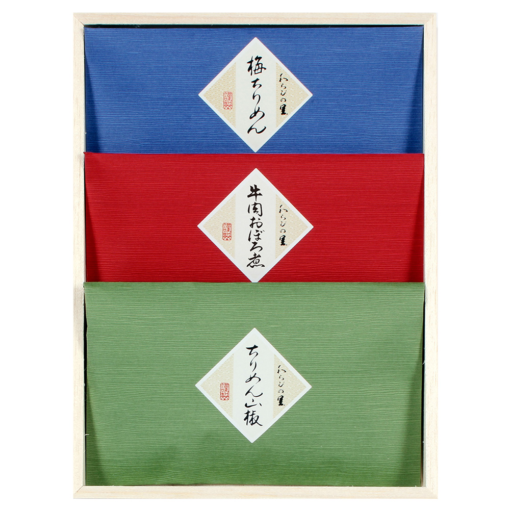 上質のちりめんじゃこと香り高い実山椒を合わせたちりめん山椒、牛肉おぼろ煮、梅ちりめんのセット