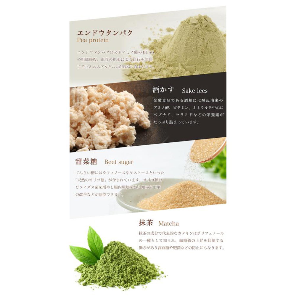 原料は4種のスーパーフードをバランスよく配合。発酵エンドウタンパクと酒粕、抹茶、甜菜糖で仕上げた100%植物性のプロテイン!ホエイプロテインに比べ、低カロリーなのでダイエットにもおすすめです!女性にうれしいタンパク補給食品(粉末プロテイン)