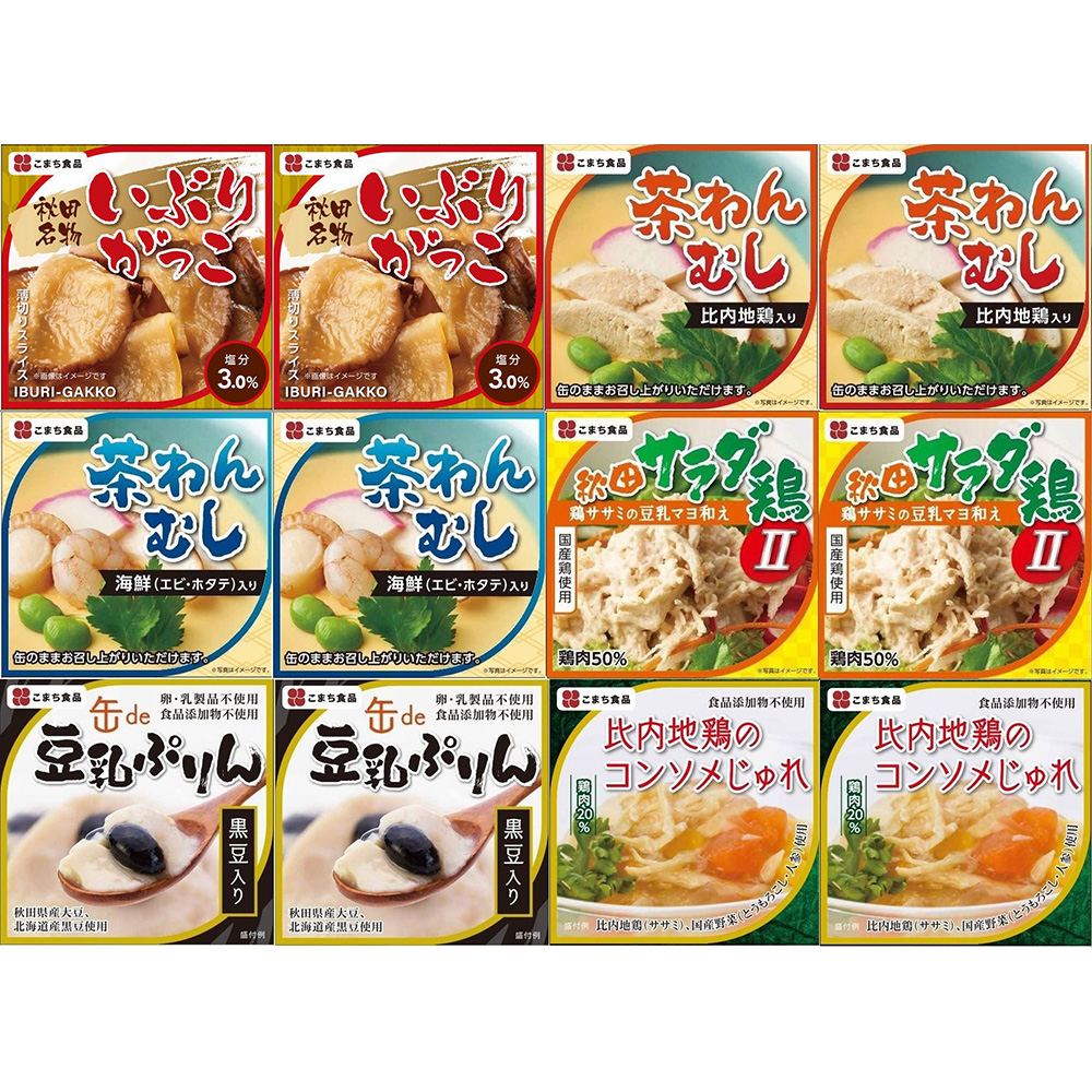 いぶりがっこ缶、比内地鶏入り茶わんむし、海鮮茶わんむし、秋田サラダ鶏II、豆乳ぷりん(黒豆入り)、比内地鶏のコンソメじゅれ、各2缶 計12缶入り