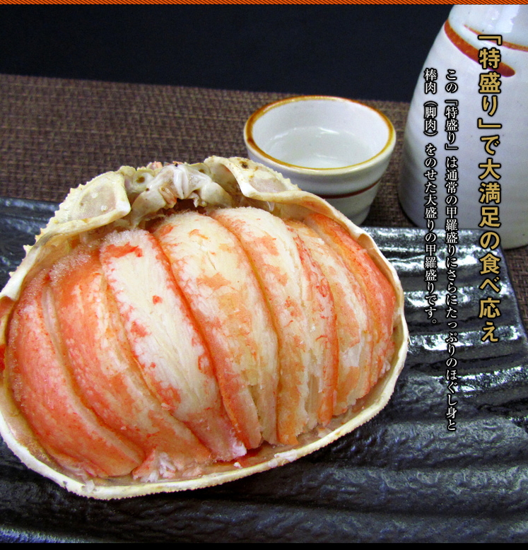 この「特盛り」は通常の甲羅盛りにさらにたっぷりのほぐし身と棒肉(脚肉)をのせた大盛りの甲羅盛りです。
