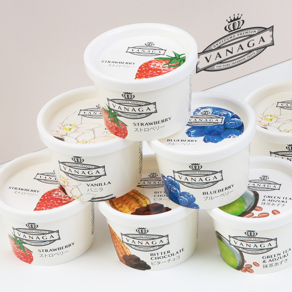 自然豊かな奥出雲地域でのびのびと育てた乳牛から搾った新鮮な牛乳と、平地飼い飼育の鶏から生まれた有精卵を使用しています。添加剤を使用せず、自然の美味しさを最大限で生かす方法でつくったアイスクリームです。また、空気の含有量を抑えて高密度に素材の美味しさを濃縮しています。濃厚でなめらかな美味しさを実現しております。バニラは香り豊かな天然バニラ香料を使用、ストロベリーは果肉がたっぷり入っています。抹茶あずきは選び抜かれた香り豊かな抹茶と 国産あずき「大納言」を使用しました。ビターチョコは上質なカカオの香りが引き立ちます。ブルベリーはワイルドブルーベリーの香りと味わいがしっかりと楽しめます。
