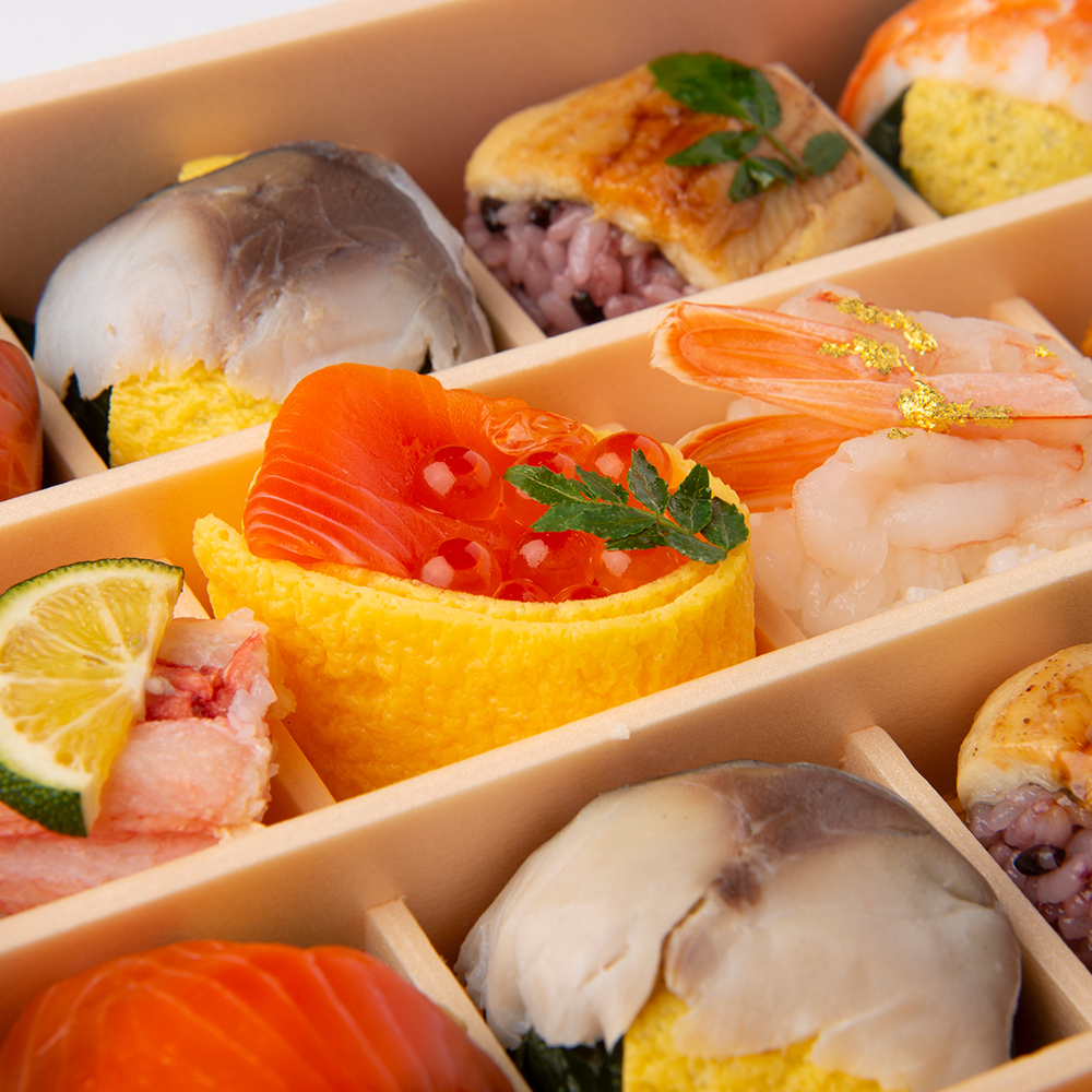 金粉をちらした手鞠赤海老、紅ずわいがに棒寿司、手鞠帆立の柚子いくら添えなど旬の味覚を贅沢に、彩り豊かに仕上げました。ひとつひとつ丁寧に作られた手鞠寿しはご家族の団らんや友人との集いに、愛らしい華を添えてくれる逸品です。