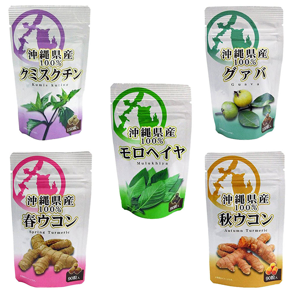 ■規格:モロヘイヤ90粒入、クミスクチン150粒入、グァバ150粒入、秋ウコン90粒入、春ウコン90粒入/全5種