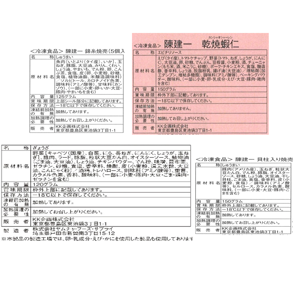 ■規格:餃子120g(6個入)×1、貝柱入焼売150g(5個入)×1、錦糸焼売125g(5個入)×1、乾焼蝦仁(エビチリソース)150g×1、本格四川麻婆豆腐150g×1、本格八宝菜150g×1