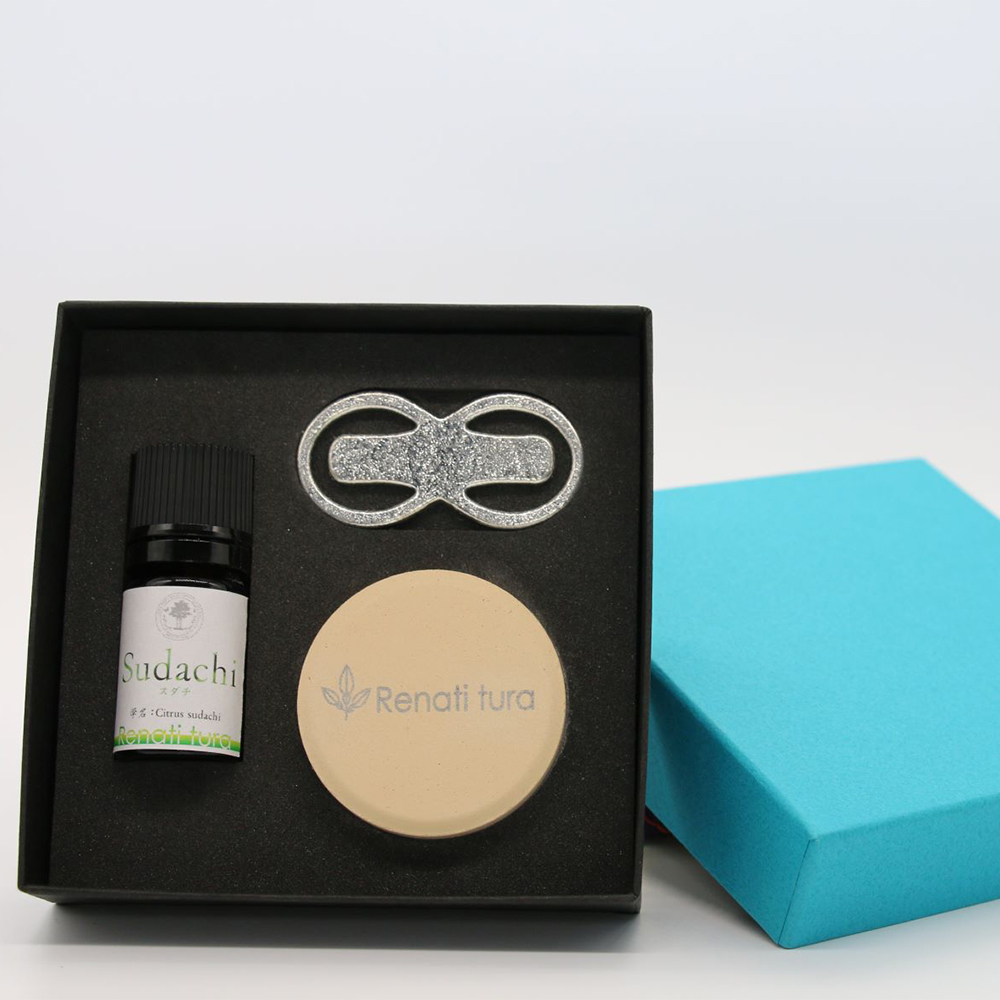 スタイリッシュにデスクに置くことが出来るお洒落な四国産精油アロマセットです。大切な人へのギフトとしてご利用ください。