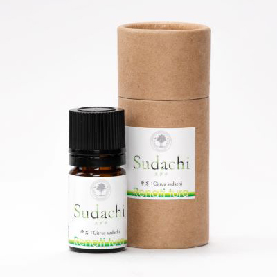 すだちは徳島県原産の香酸柑橘で、このすだちを日本で最も多く生産しているのが神山町です。「香りすだち」と言われるほどスッキリと爽やかな香りで、深い緑色が特徴です。栽培の歴史は古く、万葉の時代から利用されていたといわれています神山町には推定樹齢200年以上の古木があり、また各農家にもすだちの古木が1~2本は植えられています。特に神山町は昼夜の気温較差が比較的大きくて雨量も多いことから、香り豊かなすだちの栽培に適しています。水蒸気蒸留法のため、光毒性はございません。