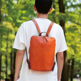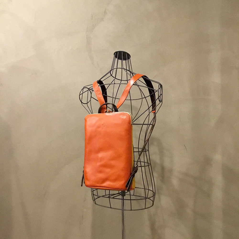 たっぷりとタンニンを使いなめした上質なオリジナルレザーとイエローの6号帆布を組み合わせた軽量スマートなリュックです。背負ったときにイエローがちらりと見えてコントラストがおしゃれ。スタイリッシュなデザインは、カジュアルからジャケットまであわせやすく、ちょっとした散策や小旅行にもおすすめです。前面には一枚革を贅沢に使用。旅番組でも使用されており、大変人気の商品です。