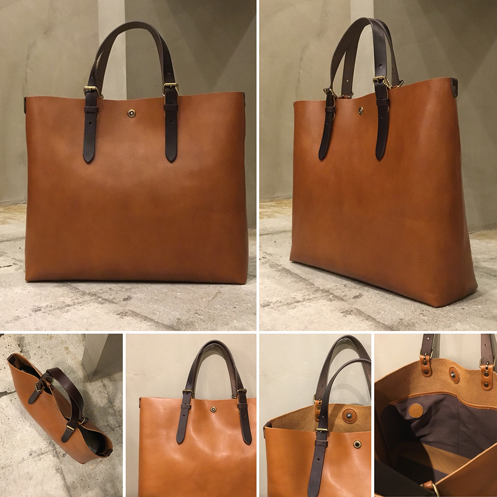 男女問わず、シーンを選ばずご使用いただけます。B4書類サイズまで対応しており、A4サイズが横にも縦にも収納可能。雑誌から500mlペットボトルまで沢山入ります。ハンドルは4段階に長さを変更可能。一見、シンプルなデザインですが、見た目や機能を踏まえ、細かいバランスを考え抜いて作りました。金属パーツがひとつ無いだけでも全く雰囲気が変わります。ホックを隠して見てもらえれば違いが分かるかと思います。本体を横長ではなく正方形っぽくする事で、カジュアル感が落ち着きスタイリッシュなイメージに。他ではあまり無い差別化したものを作りたいという思いもあり考えたバランスです。荷物が入るスペースはホックから下なので、高さを出す事で容量もアップします。定番として大変人気の高いバッグです。