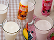 飲むヨーグルトミックスフルーツ・・・生乳(北海道)、フルーツソース(バナナピューレ、レモン糖液、バナナ濃縮果汁、オレンジ濃縮果汁、パインアップル濃縮果汁、もも濃縮果汁、もも濃縮ピューレ、オレンジ果皮ペースト)、乳製品、砂糖、ベルガモットエキス、(一部に乳成分・バナナ・もも・オレンジを含む)