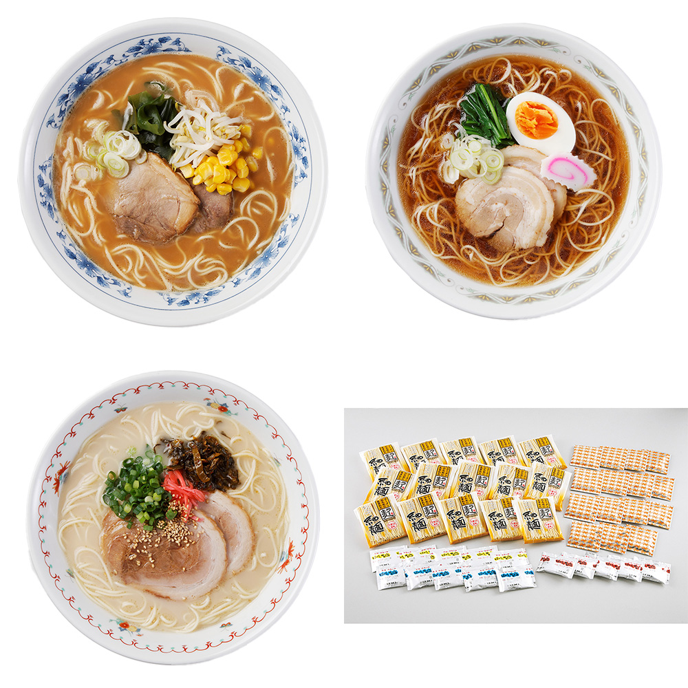 小麦の生産高全国2位の福岡県が5年の歳月を掛けて開発したラーメン専用小麦「ラー麦」を100%使用した麺に、豚骨・味噌・醤油の3種類のスープをセットしました。コシのある食感と滑らかなのど越し、淡黄で明るい麺が特徴です。