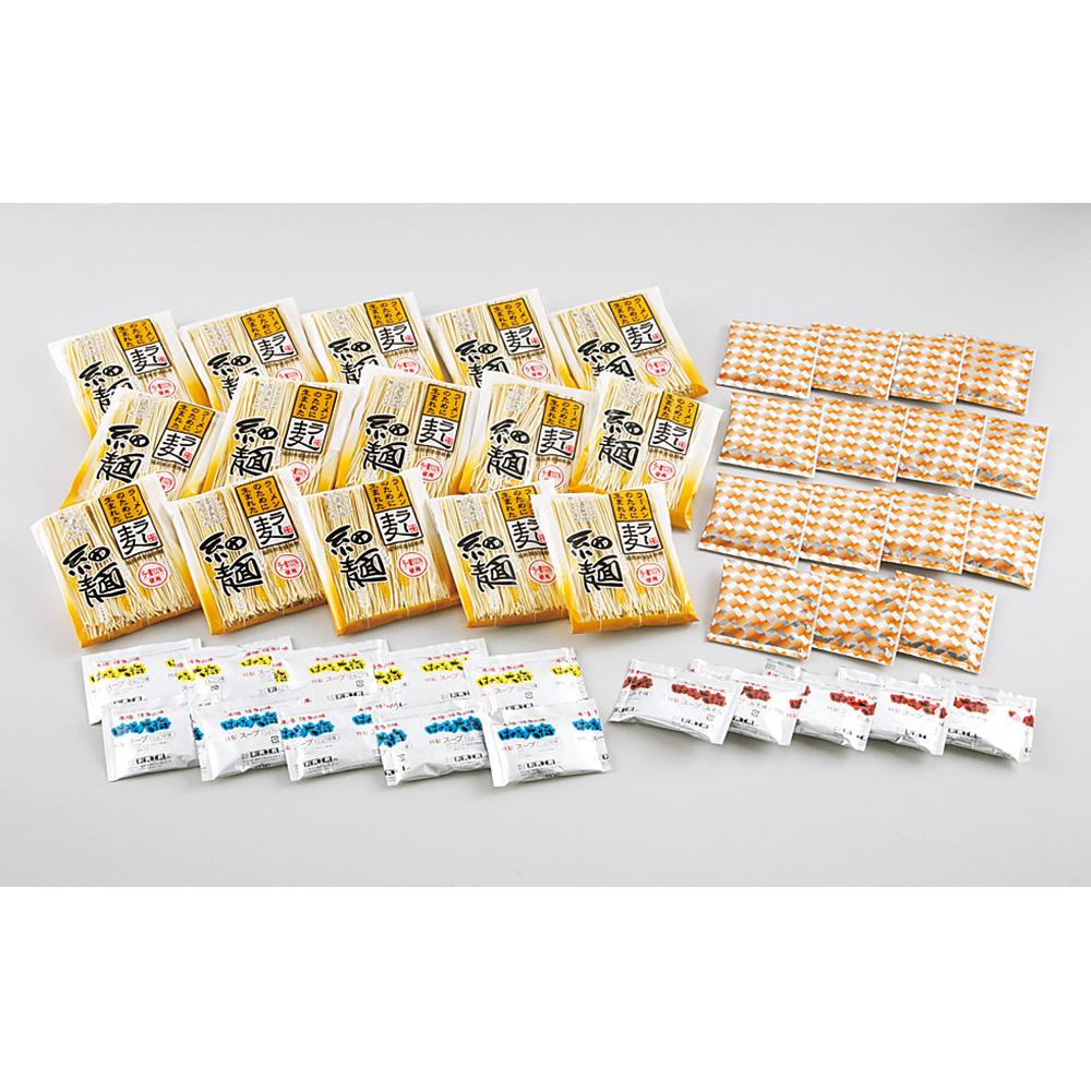 ■規格:ラー麦麺80g×15、豚骨スープ35g×5、醤油スープ35g×5、味噌スープ35g×5、ラーメンふりかけ3g×15