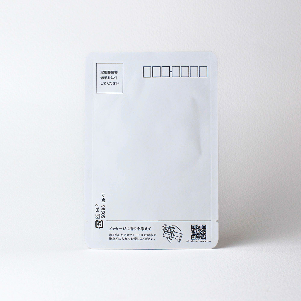 ・「オレンジ」「ユーカリ」「ラベンダー」「イランイラン」「ローズゼラニウム」の5種類のアロマシートを封入したレターカードです。