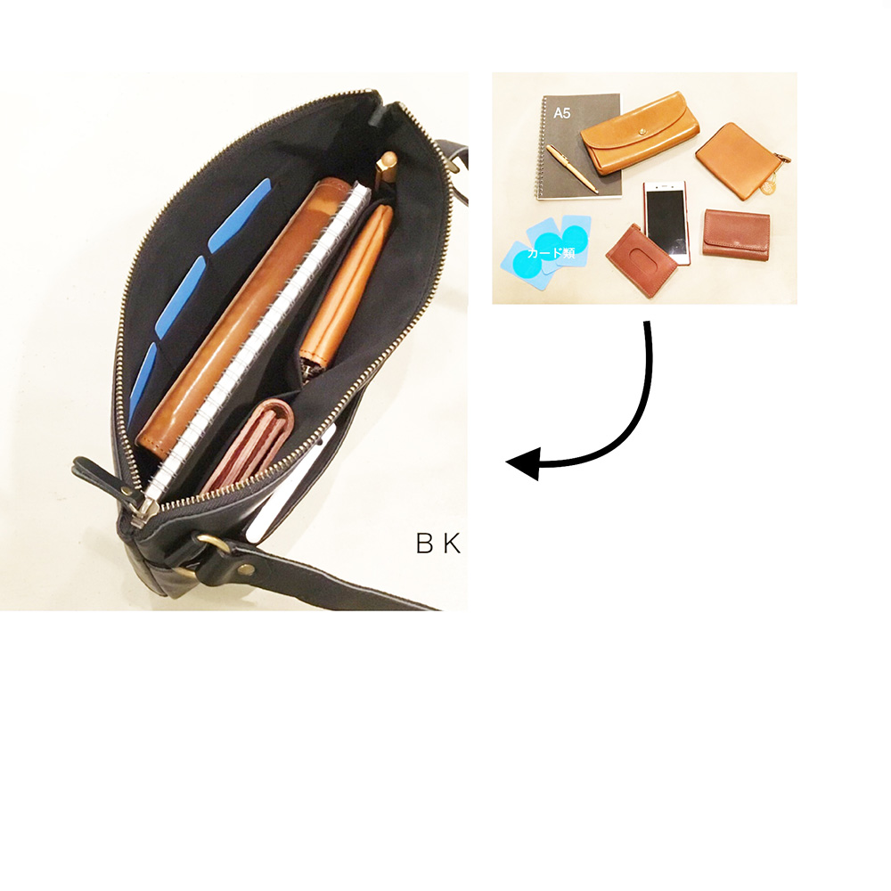 財布とスマホ、名刺入れや鍵などの必要最低限いるものだけをコンパクトに収納。タブレットを持つ方もちょうど収まるので大変便利です。普段はリュックやトートと併用し、サブバッグとして。休日はこのバッグ1つで身軽におでかけ。ヘビーユースアイテムになること間違いなしです。