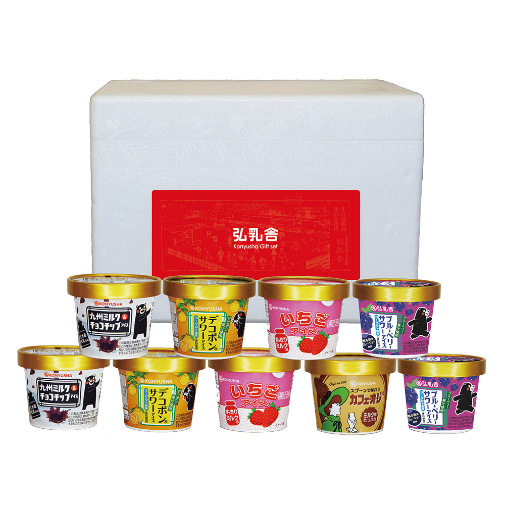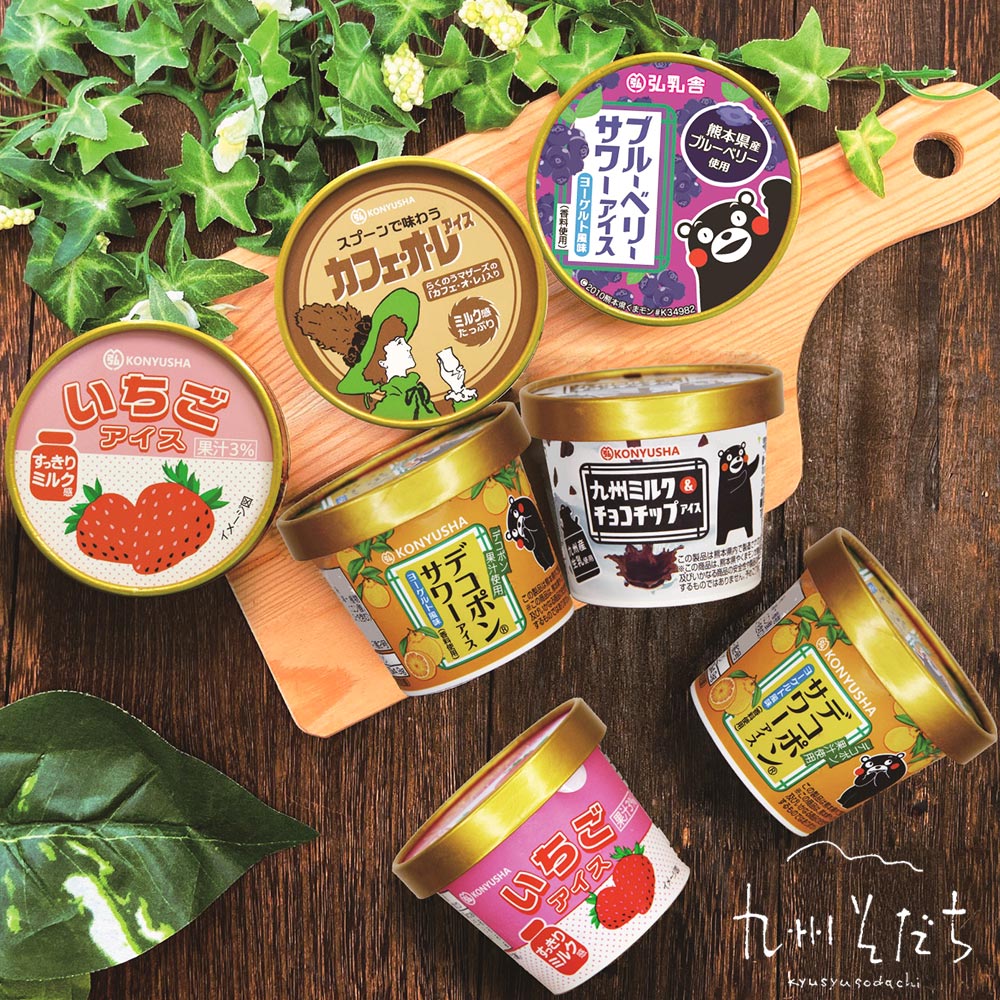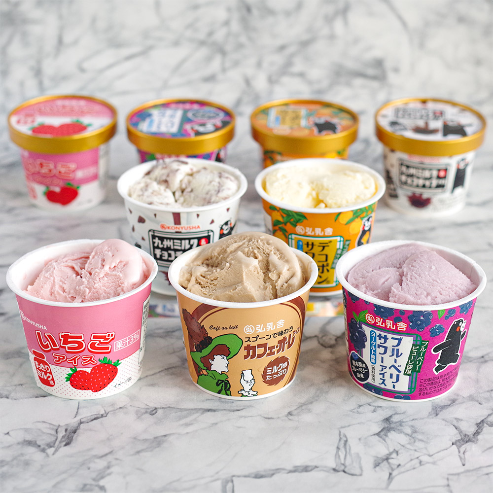 ■規格:九州ミルク&チョコチップアイス、デコポンサワーアイス、いちごアイス、ブルーベリーサワーアイス 110ml×各2個。カフェ・オ・レ アイス 110ml×1個。