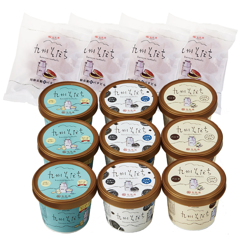 ■規格:九州そだちアイスクリーム バニラ・チーズ&クッキー・クリーム&クッキー110ml×各3個。九州そだち阿蘇山麓塩バタどら×4個